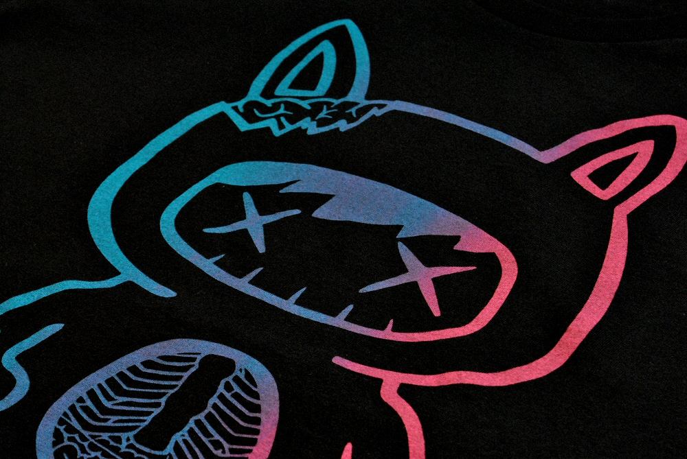 This design is screen printed using the split-fountain technique creating a vibrant effect of colors fading from blue to pink. Due to this process each shirt will vary slightly, making each one truly unique.