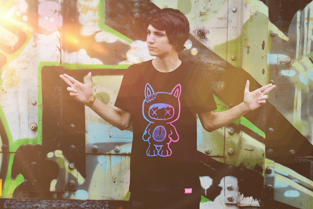 Zombie Joey is printed on a black, soft, sweatshop free, American Apparel ring spun cotton tee. The shirt is adorned with a pink hem-tag, emblazoned with the Sotare logo.