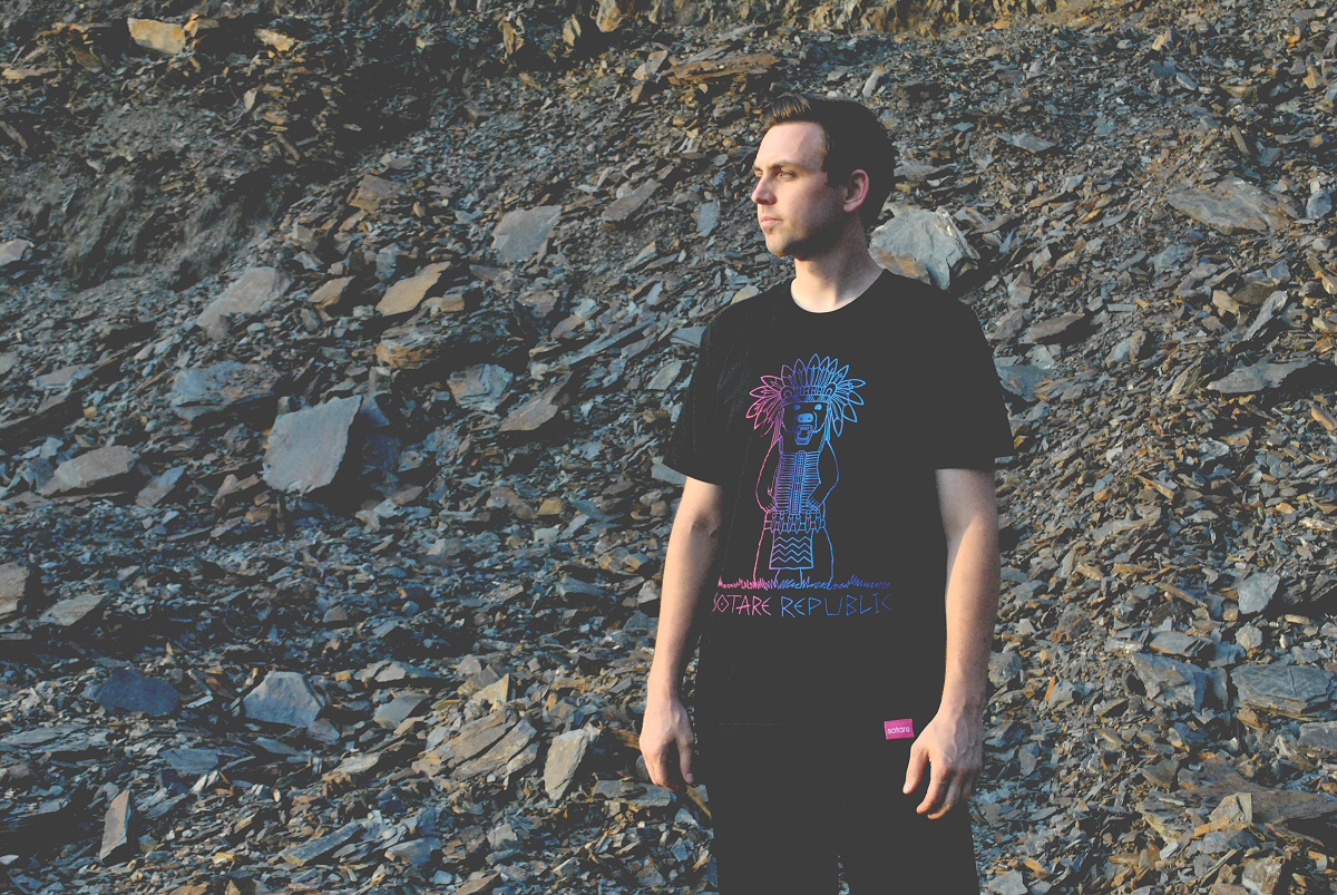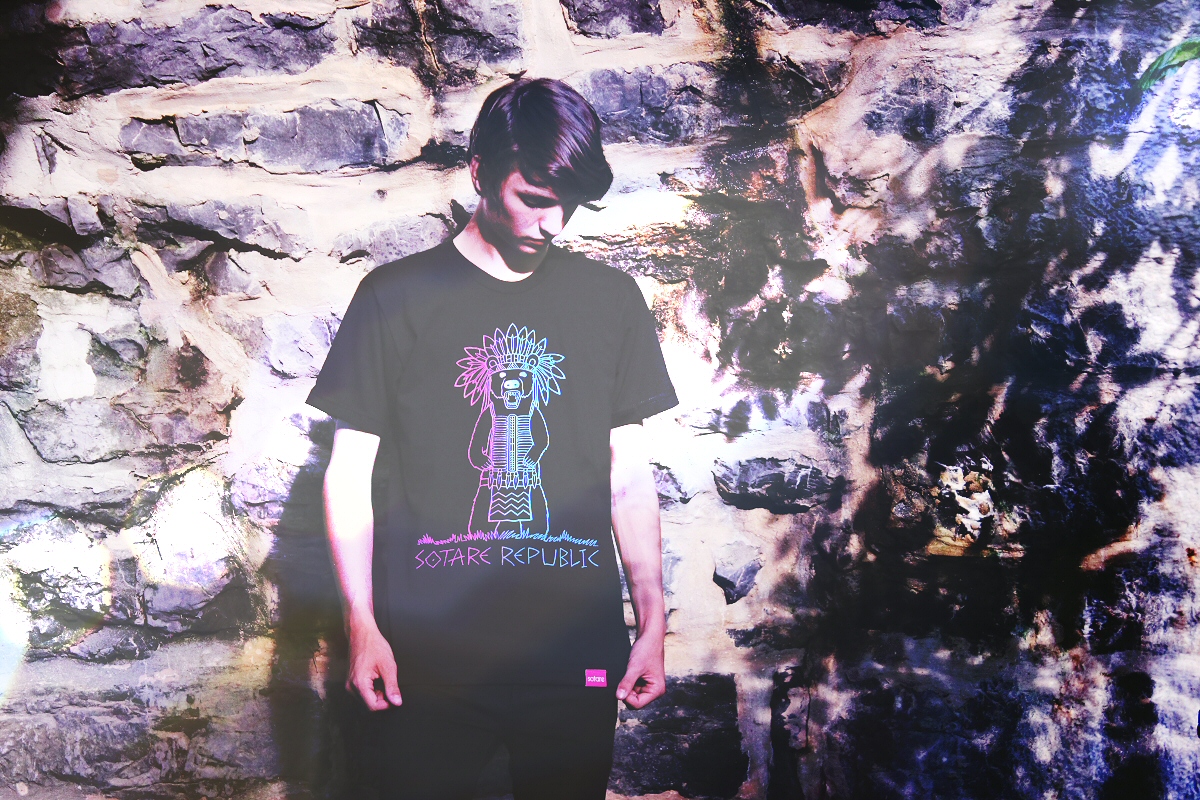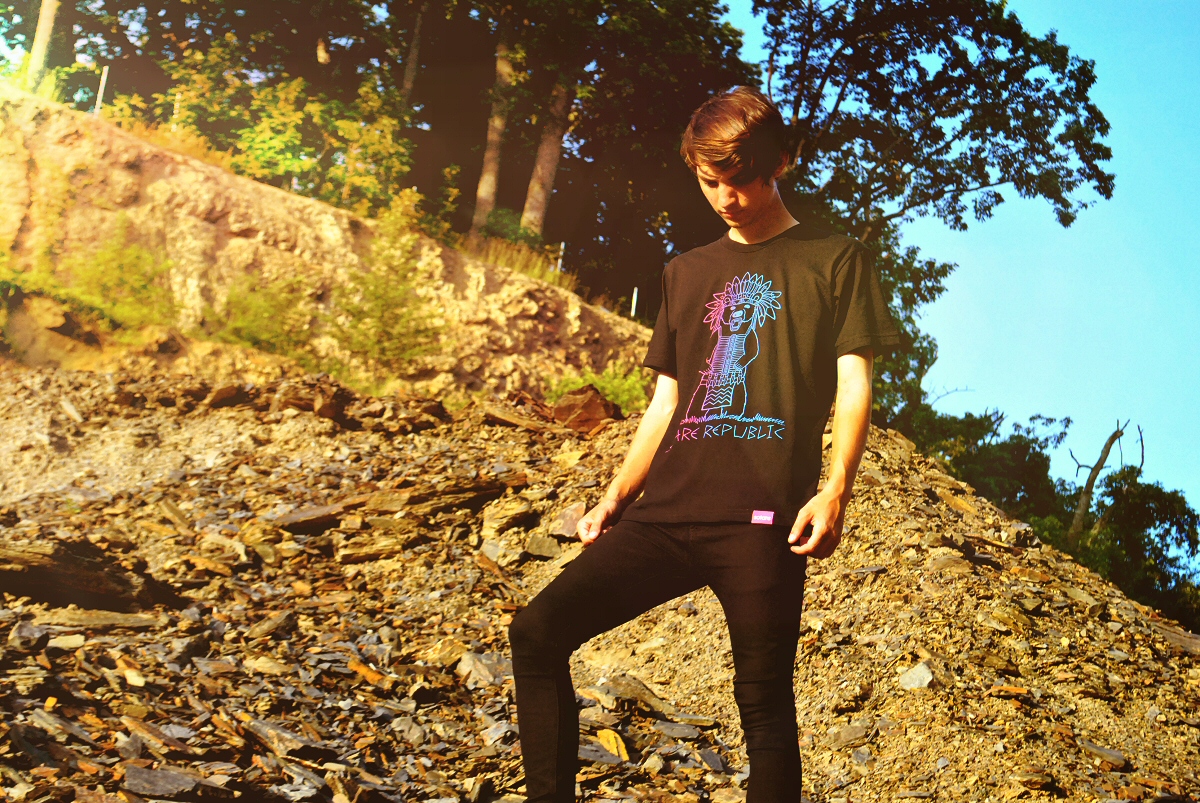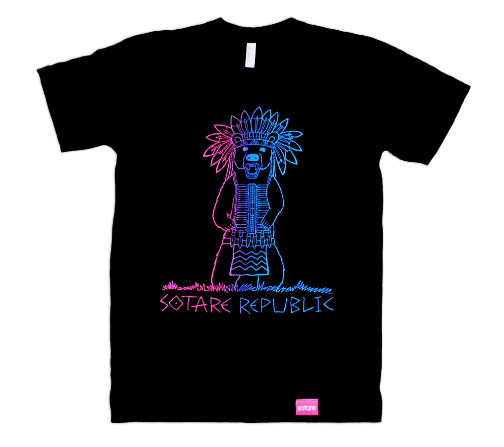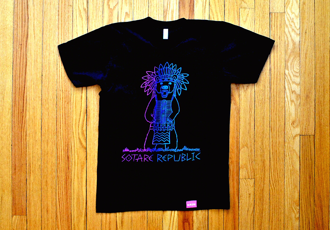 The Chief is printed using the split-fountain technique creating a unique fade from blue to pink on each jet-black, ring-supn American Apparel cotton tee.