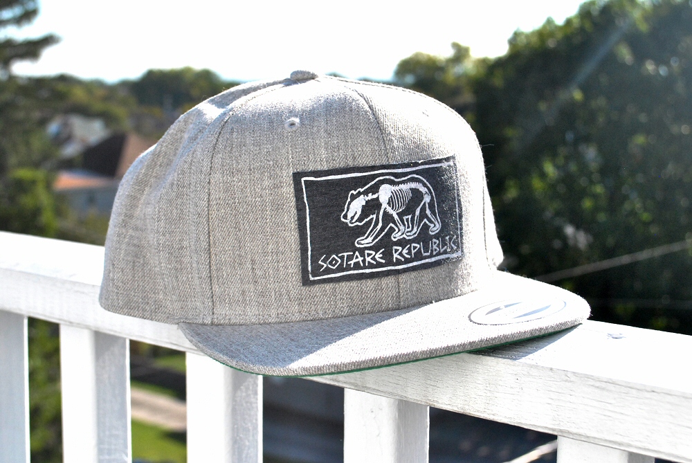 This heather grey snap back comes finished with a grey, hand screened "Sotare Republic" patch.