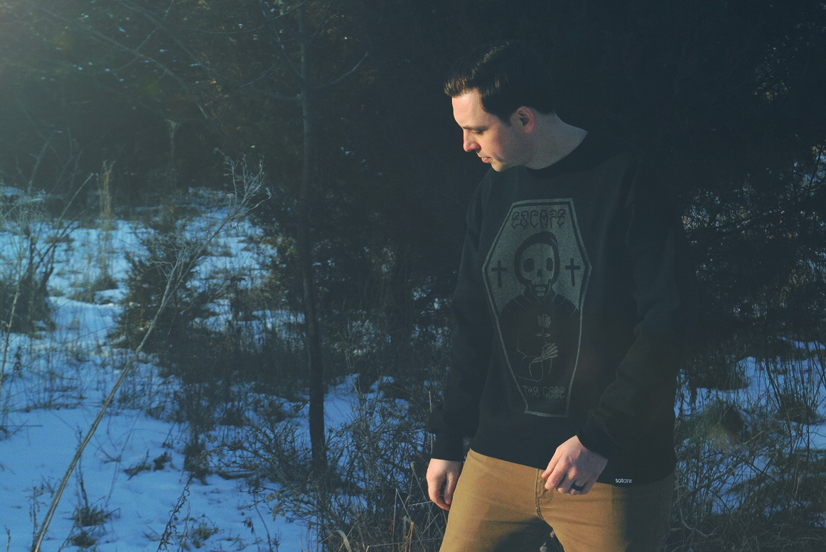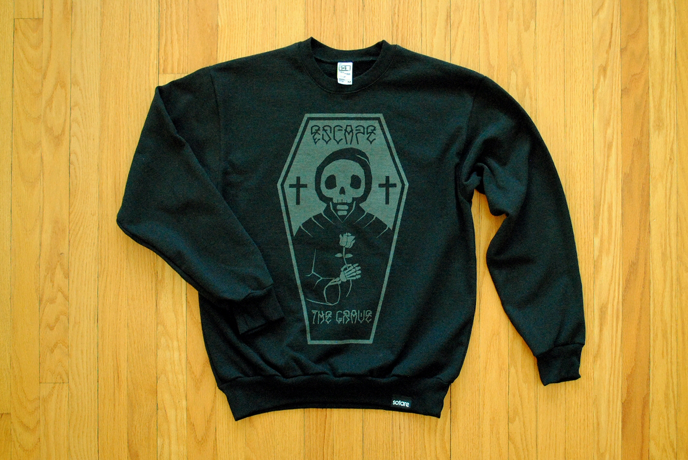 This black, made in America crew neck sweatshirt is thick, warm, and comfortable. Manufactured in downtown Los Angeles, screen printed by hand in Hagerstown, Maryland. Finished with a Sotare hem tag.