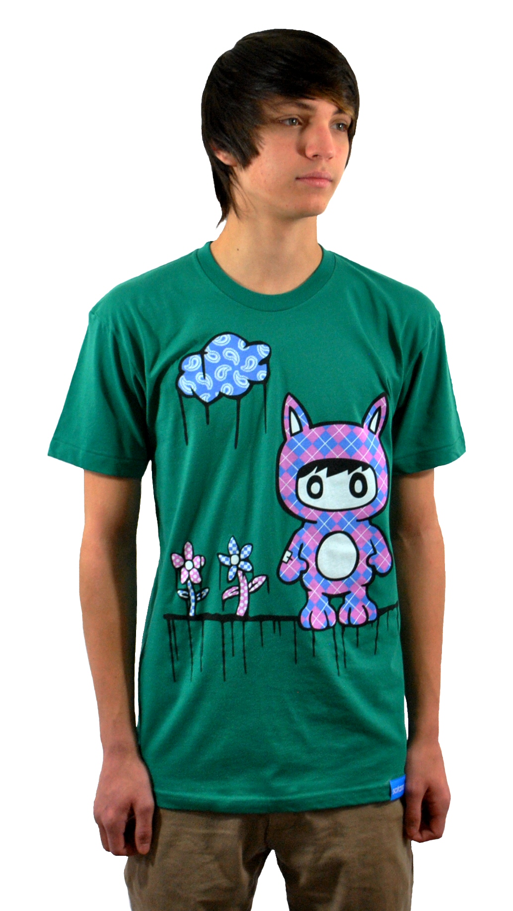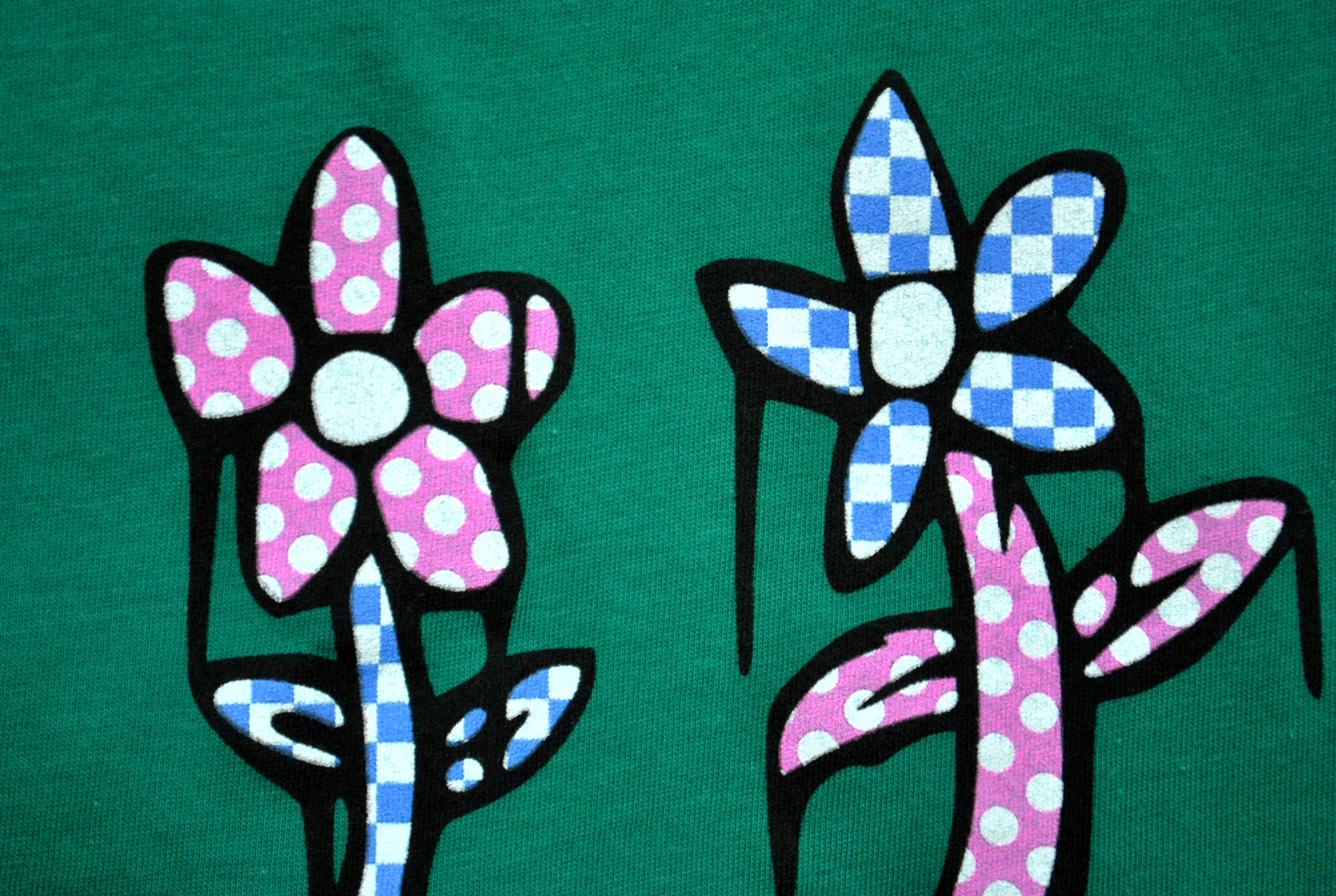 This pink, blue, black, and white design is screen printed on an evergreen American Apparel shirt. The shirt is made of 50% ringspun cotton 50% polyester.